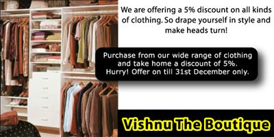 Purchase from our wide range of clothing and take home a discount of 5%. Hurry! Offer on till 31st December only.