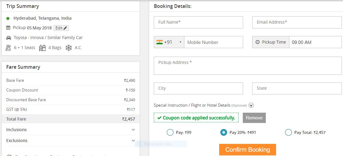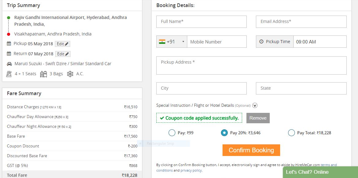 HireMeCar Coupons: Rs.200 OFF Tested on 4th May, 2018