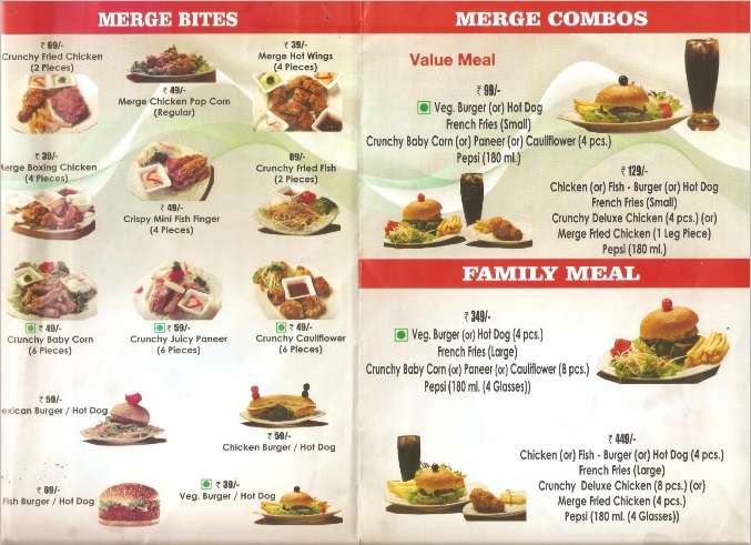 Burgers are greatly in demand at Merge. They bring to you a variety of them including the Mexican Burger, Chicken Burger, Fish Burger and Veg as well. If you are looking at something heavier and more filling, go for their value meals. This would include a Burger of your choice, French Fries, Pepsi and Fried Chicken, Baby Corn, Paneer or Cauliflower based on your order. They are amazing, fresh and crispy!