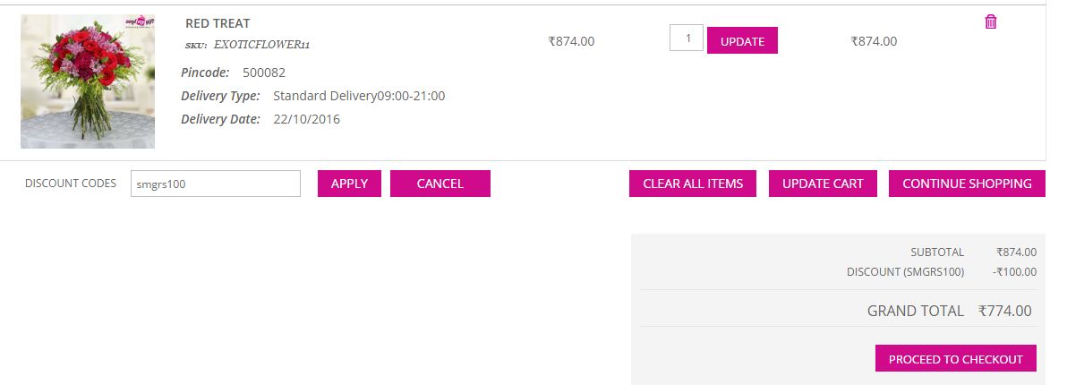Apart from Cakes and Flowers, sendmygift.com also sells to you some fantastic pieces of gifting merchandise including Chocolates, Spa Baskets, Cosmetics and other Personal Care Products, Juicers, Soft Toys, Playing Cards, Clocks, Belts, Pens, Plants, Sweets, Dry Fruits, Pooja Products and much more. You will find brands such as Lakme, Himalaya, Shehnaz, Garnier and many others to choose from. You ca go for individual products or other assorted baskets and interesting combo packs. Please share this Sendmygift discount coupon page on your social media profiles.