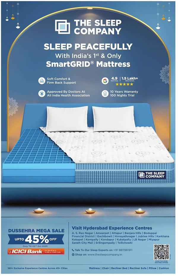 Hyderabad is well-known for shopping, be it elite brands or budget buys. There are, of course the big malls & shopping centres such as the Inorbit Mall (Hi-tech City), Sarath City Mall (Gachibowli), Forum Mall (Kukatpally), Big Bazaar (Abids, Musheerabad, Begumpet), GVK One (Banjara Hills), City Centre (Banjara Hills), Hyderabad Central (Punjagutta), Landmark (Begumpet), Lifestyle (Greenlands) and many more, that sell the latest in Indian and international brands. At the same time, one should not miss popular shopping sites as well such as Koti, Abids, Basheer Bagh, Nampally, Begum Bazar, General Bazaar, Laad Bazar, MG Road etc. Find the best of discounts, offers and sales out here for all kinds of goods. You will also find here, a number of renowned salons and spas such as Mirrors, Bubbles, Jawed Habib, L’Oréal, Naturals, O2, Tattva, The Spa at Hyatt, Serena Spa at Radisson Blu and Meghavi Wellness Spa. If you are particular about the food you eat and love exploring unique cuisines, their list of restaurants will excite you. Deccan Pavilion, Dakshin, Minerva, Blue Fox, Orchid, Haiku, Bawarchi, Paradise, Bikanerwala, Yi Jing, Ottimo Cucina Italiana, Barbeque Nation and Thai Pavillion are just a few among their multitude of culinary options. Stay over and relax at more than 30 of their fascinating resorts including Pragati, The Golconda Resorts & Spa, Celebrity, Mrugavani Resort and Spa, Dhola-Ri-Dhani, Hidden Castle, Leonia Holistic, Songs of Earth, Alankrita and Palm Exotica. Click here for best deals in Hyderabad Visit The Sleep Company Showrooms and Store outlets in Hyderabad and benefit from the ongoing Sale Offers.